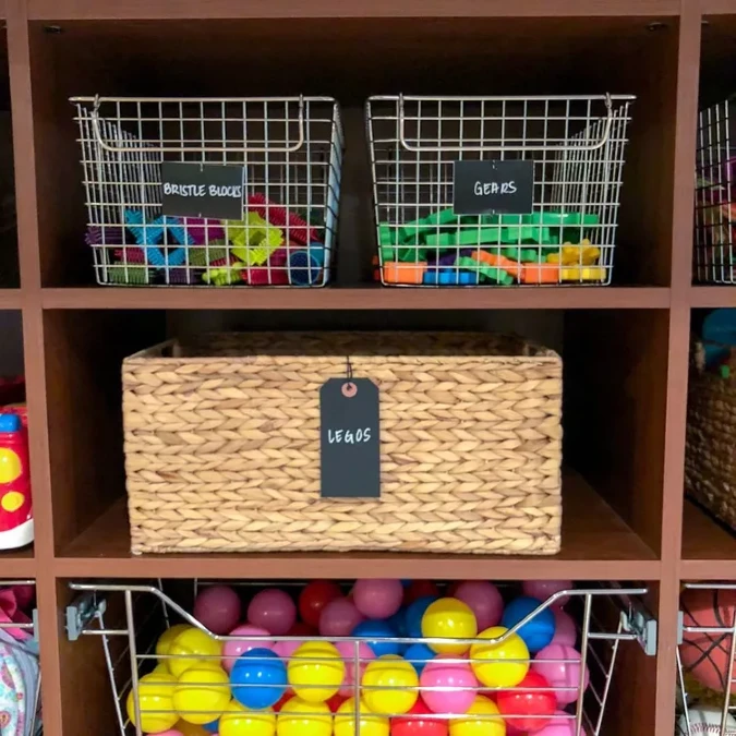 Labeling remains straightforward with dark chalkboard tags attached using simple string. Chalkboard surfaces let parents update categories as the toy collection changes over time. Attaching the bold tags to the front handles ensures contents are easily identified immediately.