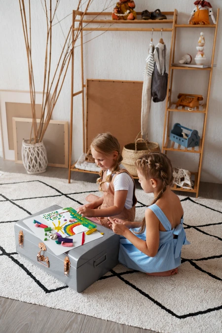 Decorative trunks eliminate the need for a separate table that clutters the room. Choosing a stylish color ensures the piece blends seamlessly with existing decor. Sitting low to the ground means the trunk does not obstruct sight lines in smaller rooms. When play finishes, simply close the lid and the storage vanishes.