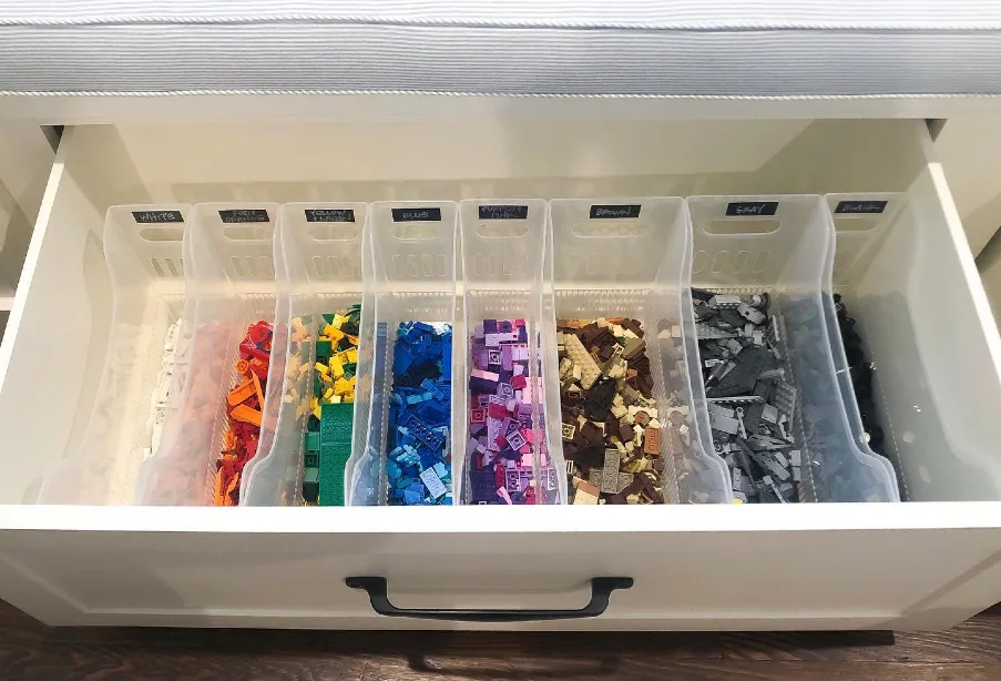 Seldom do homeowners think about using deep dresser drawers for sorting tiny pieces. This clever method transforms existing furniture into specialized storage effortlessly. Clear, vertical drawer bins slide neatly inside to separate bricks by color. Everything stays hidden from view yet remains totally accessible when the drawer is pulled open.