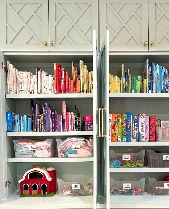 Elaborate cabinetry creates an upscale look while housing massive collections easily. These integrated units fully utilize the vertical wall space from floor to ceiling. Closing the ornate doors completely hides the colorful clutter inside for instant neatness. Builders can store bricks, manuals, and even display finished creations all within one structure.