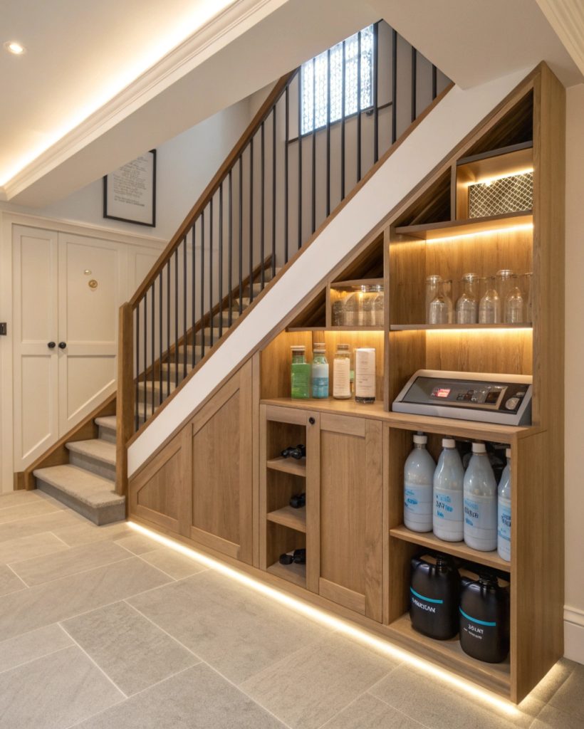 The triangular space, typically relegated to holiday decoration storage or forgotten clutter, transforms into a sophisticated hydration depot that takes advantage of the home’s most underutilized real estate.