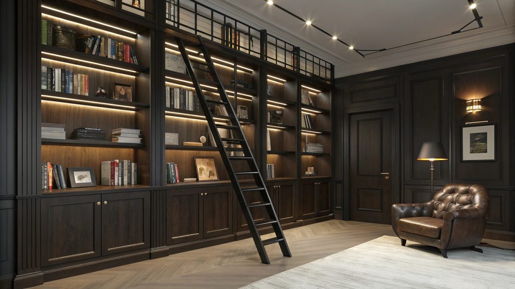 Channel the grand library aesthetic with a floor-to-ceiling storage wall complete with a sliding ladder for accessing upper shelves. This system transforms your entertainment room into a sophisticated library setting while providing massive storage capacity. The industrial-style ladder adds functional charm and makes even the highest shelves easily accessible.