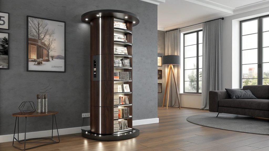 - Design: Cylindrical rotating tower with adjustable shelves, integrated LED lighting, and smooth ball-bearing rotation mechanism in brushed steel or walnut finish.