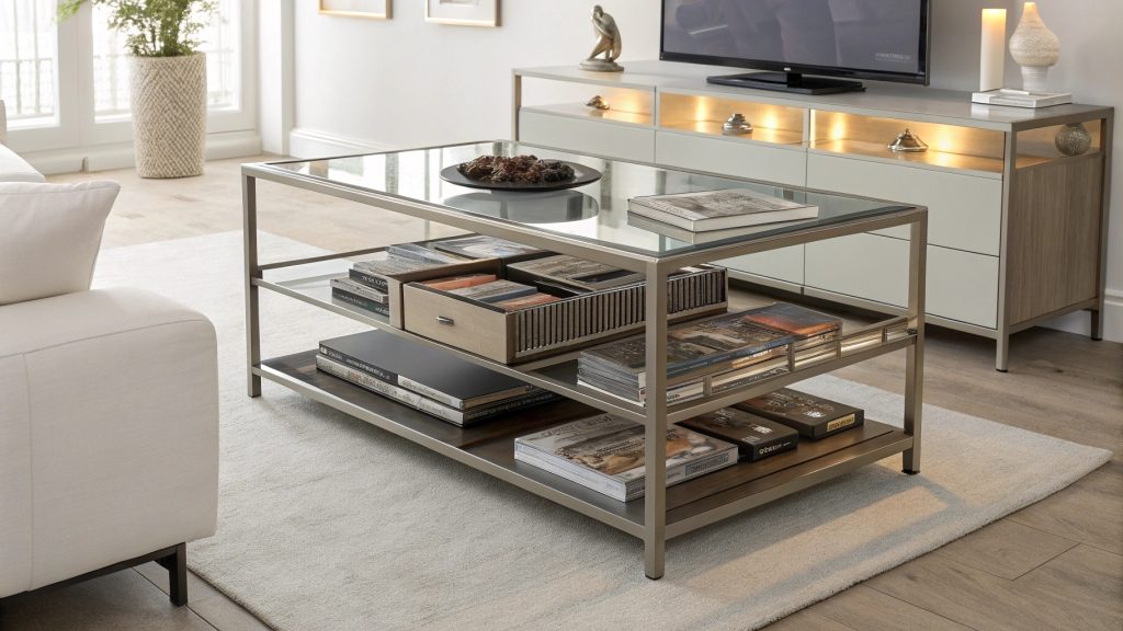 - DIY Tip: Add hinges to existing coffee table and install battery-operated LED strips; use adjustable dividers for organization flexibility.