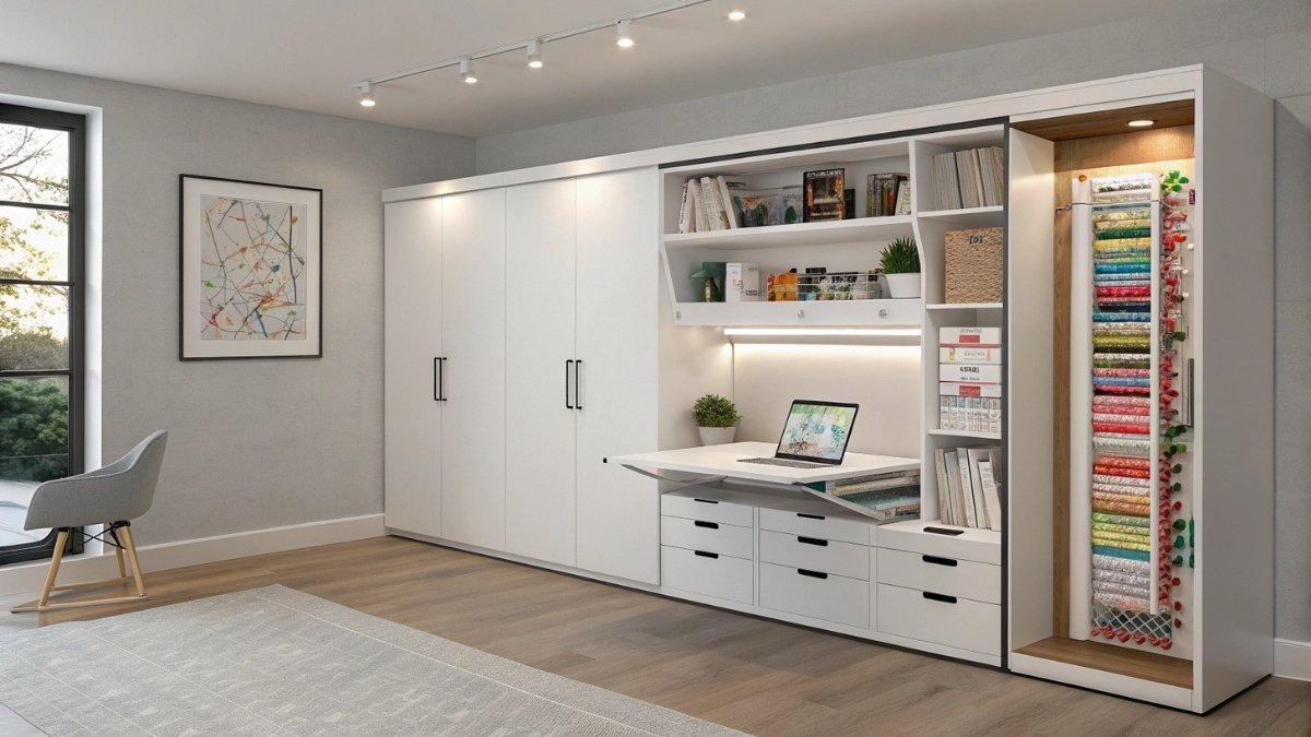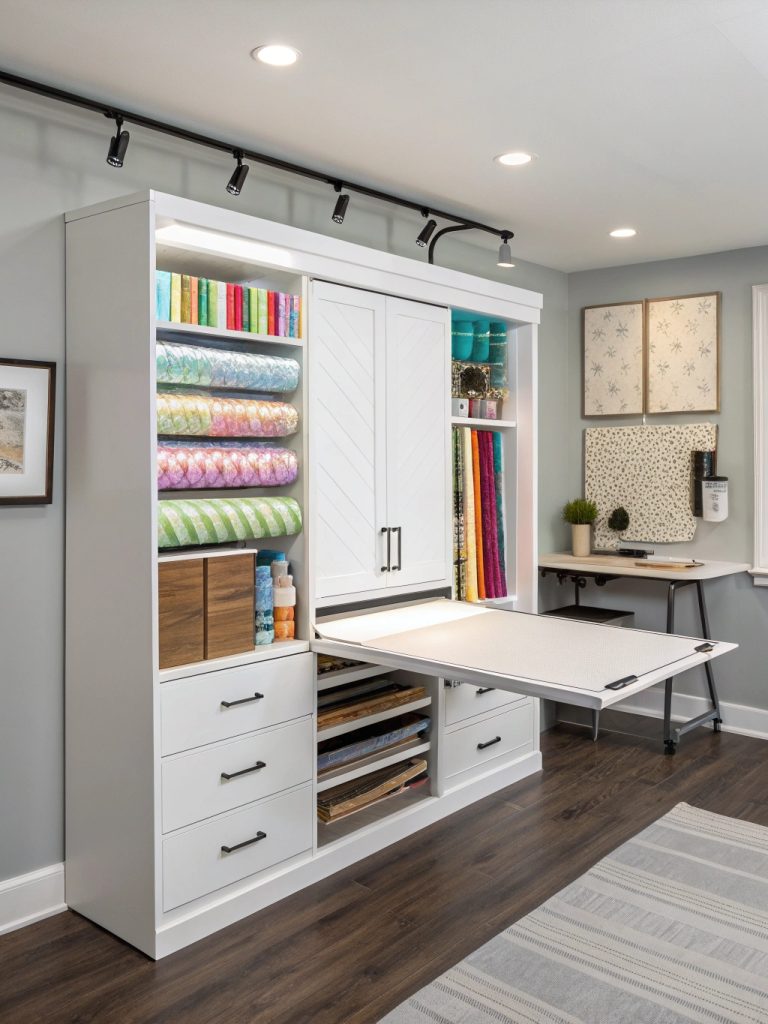 - Organization: Custom dowel system for rolls, vintage mason jar ribbon storage, labeled fabric bins, and fold-out cutting board.