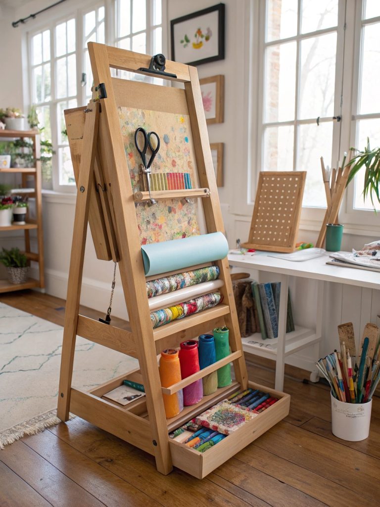 - Design: Adjustable wooden easel with custom storage attachments, magnetic tool strips, and integrated cutting guides with professional art supply organization.