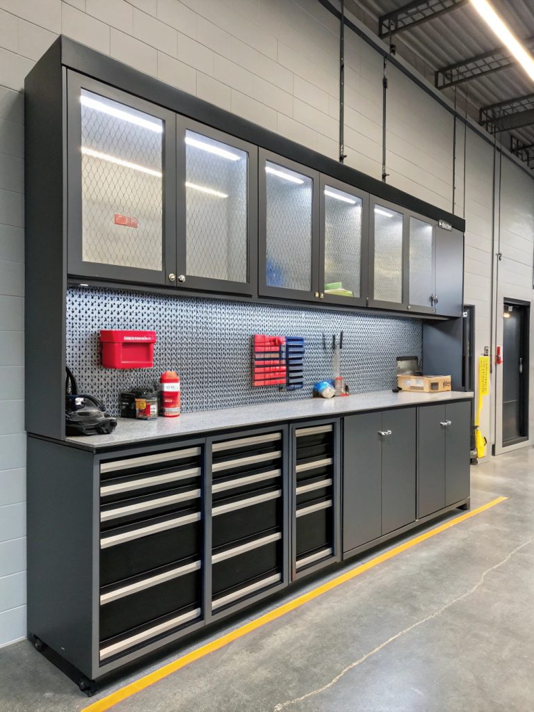- Design: Powder-coated steel cabinets with heavy-duty hinges, perforated panel backsplash, and professional tool organization system.