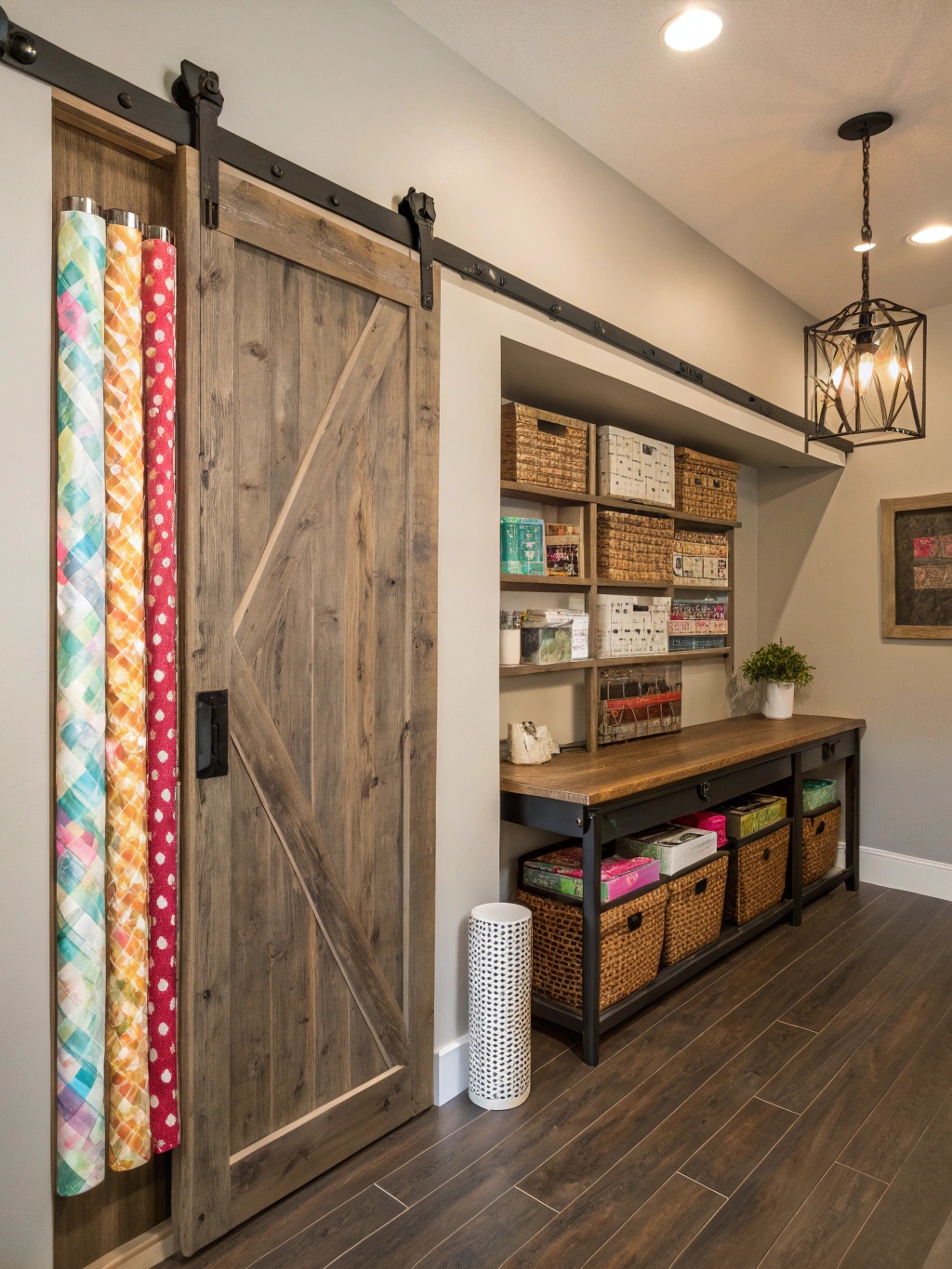 Picture this: what appears to be a rustic barn door accent wall suddenly slides away to reveal the ultimate gift-wrapping headquarters. This ingenious solution capitalizes on the farmhouse aesthetic trend while hiding a meticulously organized workspace that would make professional gift wrappers weep with joy.