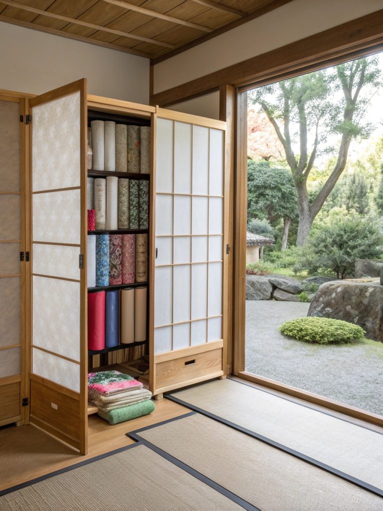 - Design: Traditional shoji screen construction with rice paper panels, integrated bamboo rod system, and concealed organizational compartments.