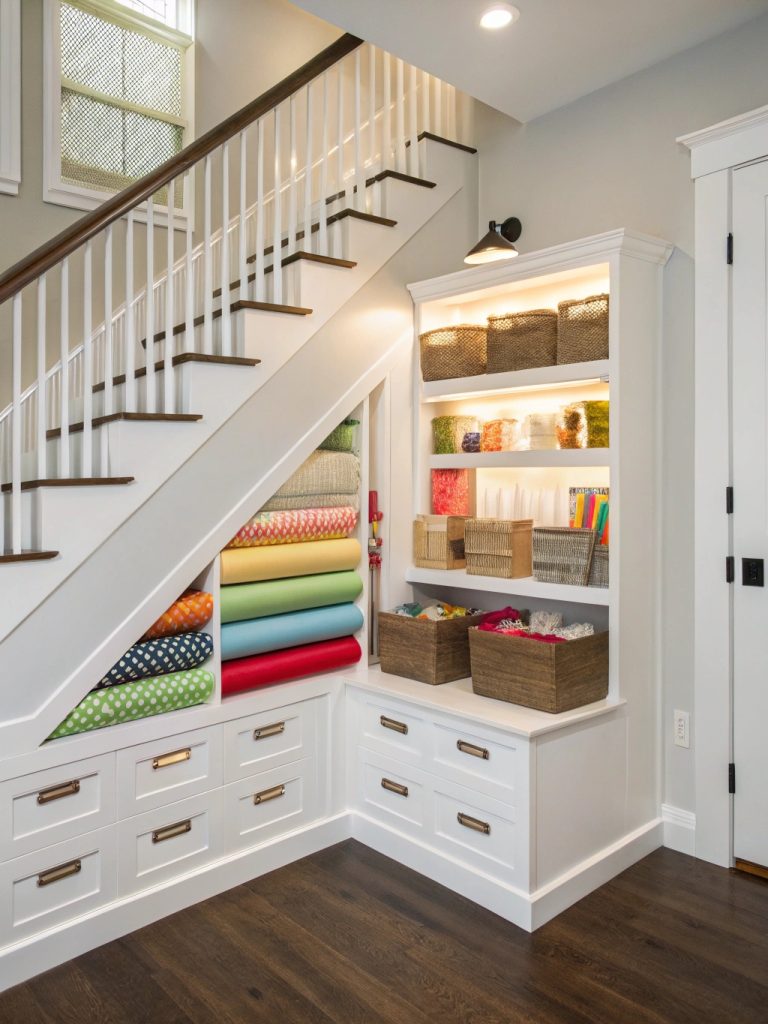 Why let that awkward under-stair space collect dust when it could become your secret gift-wrapping sanctuary? This design maximizes every inch of this typically wasted area, creating custom storage solutions that follow the unique angles while providing easy access to everything you need.