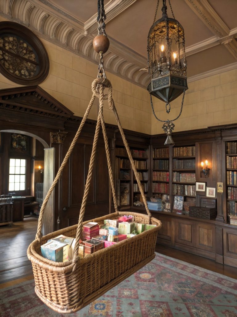 - Design: Antique-style rope and pulley system with woven baskets, brass hardware, and integrated safety stops.